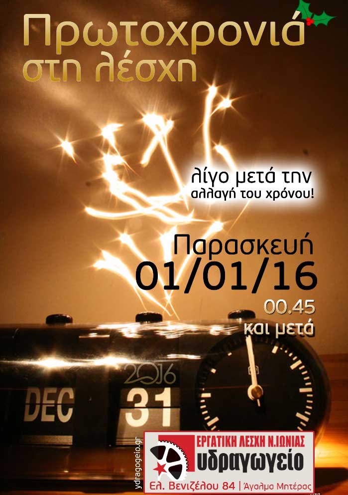 Σας προσκαλούμε να γιορτάσουμε παρέα την αλλαγή του χρόνου στην Εργατική Λέσχη Νέας Ιωνίας με μουσική, ποτά, φαγητό και κουβεντούλα.