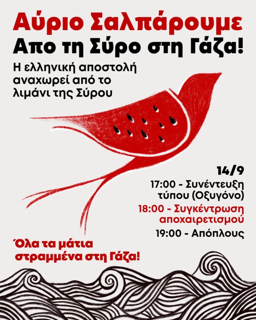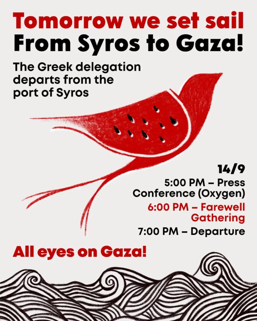 - Να παραμένουμε συντονισμένες και συντονισμένοι με την πορεία του στόλου και να είμαστε σε απόλυτη ετοιμότητα για κινητοποιήσεις όσο θα διαρκέσει το εγχείρημα, σε περίπτωση επίθεσης ή αναχαίτησης του από το Ισραήλ και για όσο συνεχίζεται η γενοκτονία στη Γάζα.