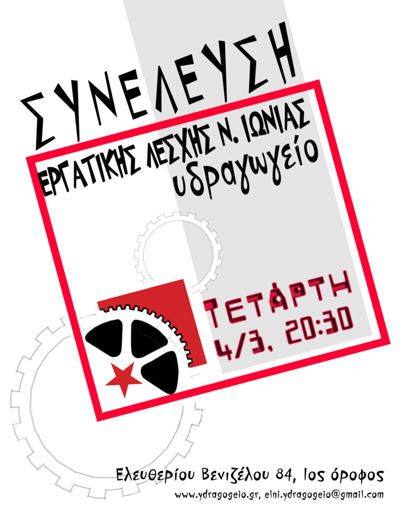 Την Τετάρτη 4 Μαρτίου στις 8:30μμ θα πραγματοποιηθεί η μηνιαία μας συνέλευση συνέλευση στον χώρο της Εργατικής Λέσχης Νέας Ιωνίας “Υδραγωγείο”, Ελ. Βενιζέλου 84, Αγαλμα Μητέρας, όπου θα συζητήσουμε και οργανώσουμε τις δράσεις μας. Σας καλούμε όλους/ες να συμμετέχετε στη συνέλευση. Θα δούμε πρόγραμμα μαθημάτων-εργαστηρίων, εκδηλώσεις-συζητήσεις, ομάδες παλιές και νέες και δράσεις επόμενου διαστήματος.